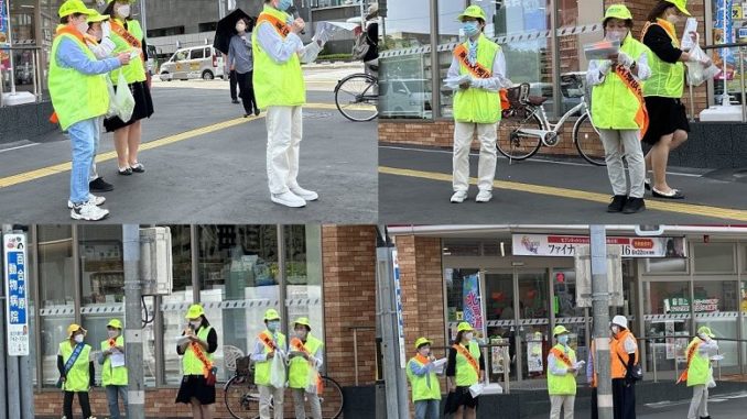 6月は自転車を利用する人が増える時期です。このため、栄東地区交通安全母の会(杉澤靖子・会長)では、6月16日、地下鉄栄町交差点で自転車の交通事故防止と自転車に乗る上でのマナー向上を呼びかける街頭啓発を実施しました。