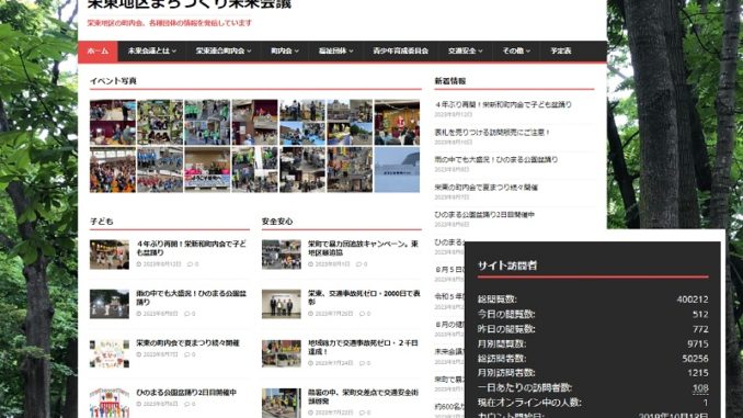 8月13日、栄東地区まちづくり未来会議のホームページのアクセスが、40万件を突破しました。30万件達成が本年3月15日でしたので、わずか5か月余りで10万件アクセスがあったことになります。