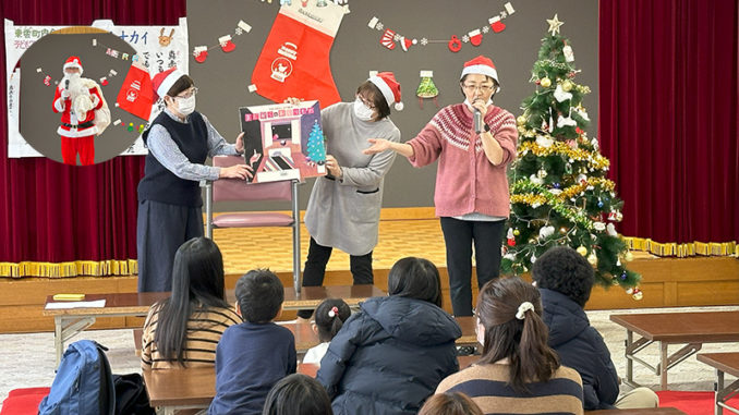 (写真上は、読み聞かせとサンタさん)