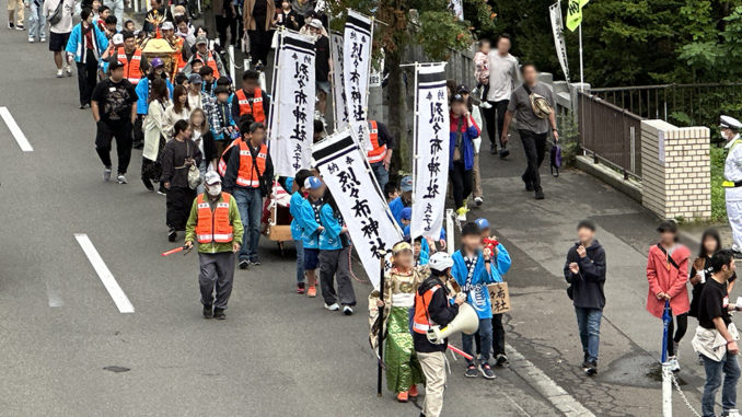 同神社の東側に集まった子どもたち総勢約40名余りは、おそろいの青い法被を着て神輿を引きます。先頭の子どもは狩衣姿で、幟を立て神輿と太鼓を引いて広い町内エリアを練り歩きます。先導者のスピーカーからは、「子ども神輿が通ります。お参りください。お賽銭もお願いします」と放送し、「ワッショイ、ワッショイ」の掛け声とともに太鼓を打ち鳴らします。