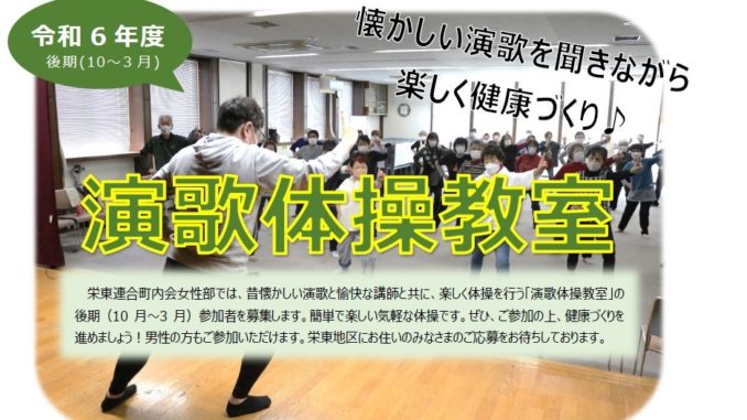 栄東地区で大ブレーク中の演歌体操教室ですが、10月15日から始まる後期の参加者を募集しています。お馴染み軽妙な語り口で大人気の大高一郎先生の指導で、昔懐かしい演歌やポップに合わせて楽しく体操します。2部制で各1時間余りの体操です。