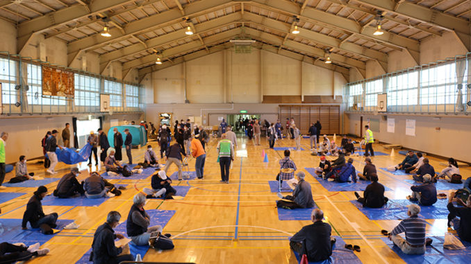 10月6日、栄南小学校で栄東地区などの住民120名が参加して、実践的な避難所運営訓練が開催されました。これは、北海道胆振東部地震の教訓を生かし、万一の大災害時に住民が自ら避難所を開き、運営できるようにと栄東連合町内会防火防犯部(中谷暁生・部長)が毎年、企画実施しているものです。