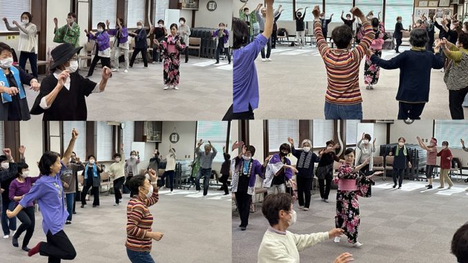 この日の新曲は、「星降る街角」です。ちょっとリズミカルで早い動きですが、曲を流す前に、講師が1曲の振りを教えます。曲をかけると盆の踊り・星の降る街角バージョンが完成です。その後は、「ソーラン節」「夜に駆ける」「すみだ音頭」「長生きサンバ」と既習の踊りをが続き、最後は、「ダウンシングヒーロー」で弾けます。