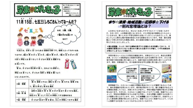 小学校版は、11月15日の七五三の由来、中学校版は、割れ窓理論など犯罪論を取り上げています。