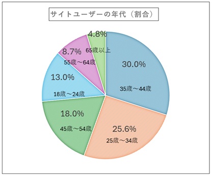 年齢では、「35歳~44歳」30.0%、「25歳~34歳」25.6%、「45歳~54歳」18.0%、「18歳~24歳」13.0%で54歳未満が8割を占めています。これに対して「55歳~64歳」8.7%、「65歳以上」は4.8%で、シニア層では利用者が少ないという結果になっています。