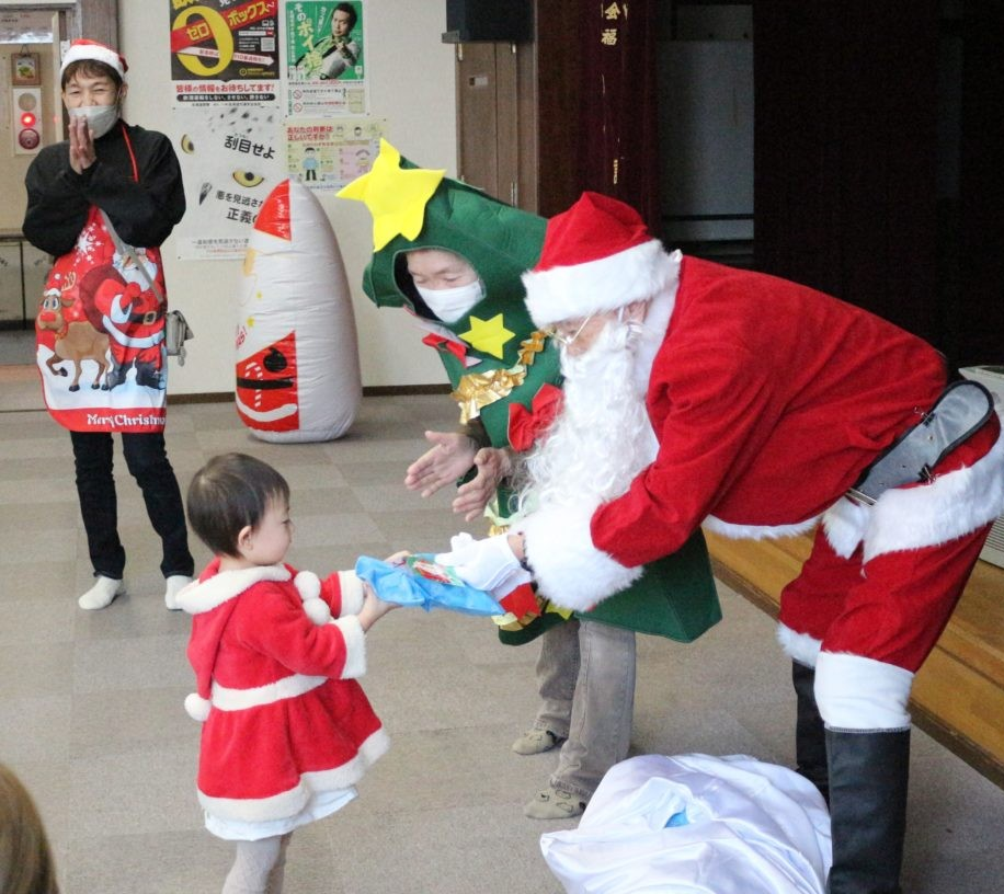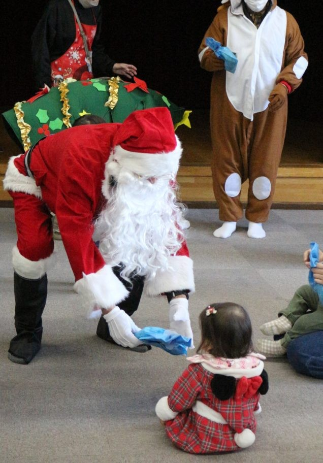そして、会場内に「ジングルベル」の曲が流れると、子どもたちは歌を口ずさみ、リズムにのりながらサンタさんたちの登場を待ちます。サンタさん・ツリーさん・トナカイさんの登場に子どもたちは大興奮です。サンタさんから大きな袋に入ったプレゼントをもらったあと、ツリー前で記念撮影を行いました。中には近くで見るサンタさんにおっかなびっくり泣いてしまうお子さんも。それでも最後は、名残惜しそうに手を振って優しいサンタさんたちを見送り、クリスマス会は大盛況のうちに幕を閉じました。