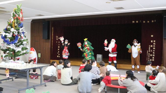 クリスマスイブの12月24日、日の丸会館で子育てサロン「ちびっ子らんど」のクリスマス会が行われました。参加したのは11組24名の親子で、クリスマスツリーをバックに記念撮影をしたり、会場いっぱいに広げられたおもちゃで遊んだり、お母さん同士で情報交換したり、思い思いにクリスマスの雰囲気を楽しんでいました。