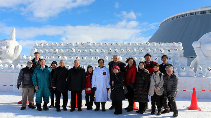 ウエルカム雪像の前で、秋元札幌市長と記念撮影する雪像制作者のみなさん
