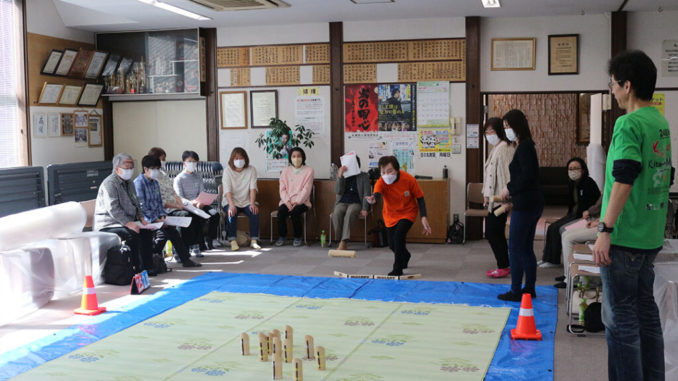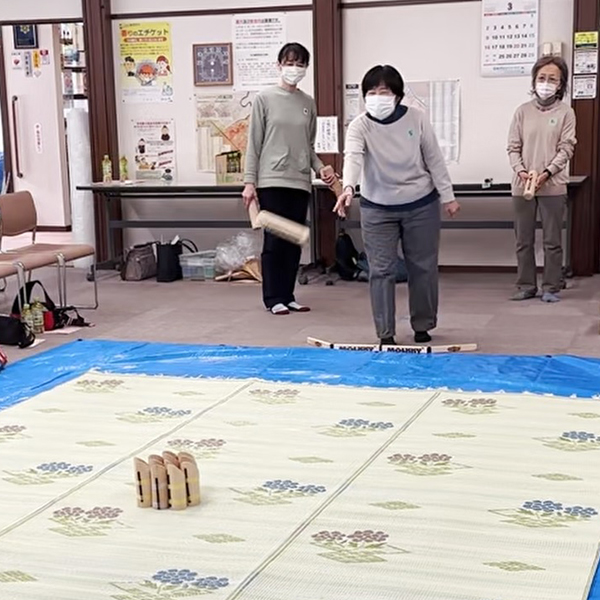 会場は日の丸会館の大ホールで、室内のため、床が傷まないようにブルーシートや花ござで養生し、2面の試合コートをつくりました。メンバーから、簡単にモルックの基本的なルールやモルック(投げる棒)、スキットル(木製のピン)、モルッカーリ(モルックを投げる位置)、得点の仕組みなどの説明がありました。まず、実際にモルックを投げてみます。最初はなかなかスキットルに当たりませんが、上手く当たると会場から歓声が沸きます。
