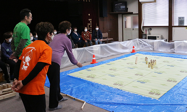 「早春女性の集い」は、栄東地区で日ごろ町内会活動の中心になって活動している女性部の皆さんを集め、情報交換や親睦を図るイベントです。今年で第39回目となりますが、趣向を変えて、新しい健康づくりのスポーツとして注目される、フィンランド生まれのモルックを体験しました。