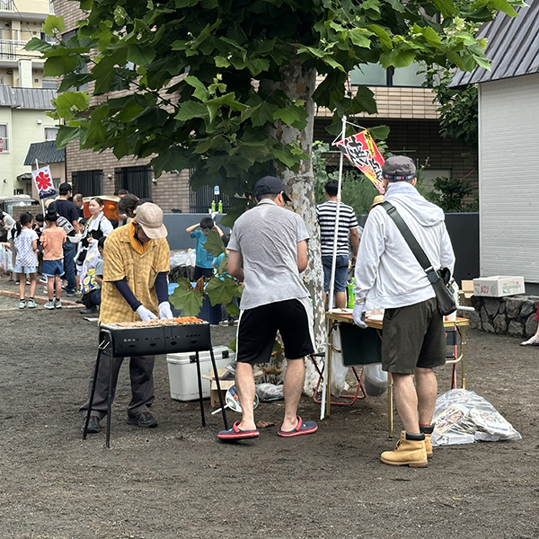汗だくになりながら焼き鳥やフランクフルトを焼く町内会役員のみなさん