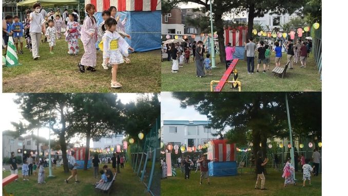 町内会単独での子供盆踊りは、市内でも激減していますが、同町内会では、7月27日に子供夏祭りを実施したばかりですが、子どもたちが多い地域ということもあって、イベント第2段の「盆踊り」を8月9日・10日の両日に、栄新和第一公園(東区北46条東10丁目)で開催しています。
