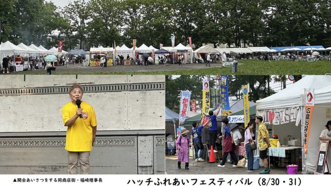 栄町中央商店街振興組合が主催する「ハッチふれあいフェスティバル」が、ひのまる公園(東区北41条東10丁目)で絶賛開催中です。8月30日は、朝からあいにくの雨でしたが、昼近くに雨が上がり、気温も過ごしやすく、絶好のお祭り日和になりました。多彩なプログラムで一日楽しむことができます。今日、明日、ぜひ、ご家族連れでおこしください。