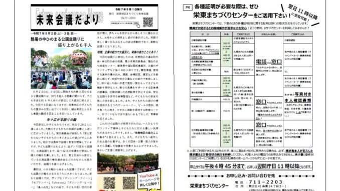 今号では、8月2日・3日の「ひのまる公園盆踊り」の模様と栄東まちづくりセンターの諸証明交付手続きについて取り上げています。