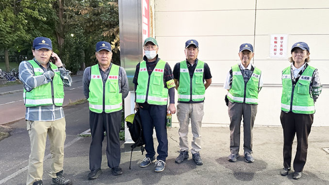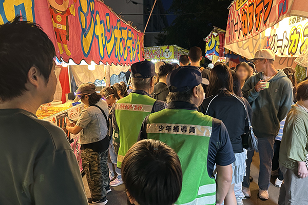 9月14日、15日は、烈々布神社の宵宮祭と例大祭ですが、初日の14日、少年補導員7名が参加してお祭りの巡視を実施しました。午後6時、近くの店舗駐車場に集合し、宵宮祭で賑わう境内やその周辺のひのまる公園などを巡視パトロールしました。