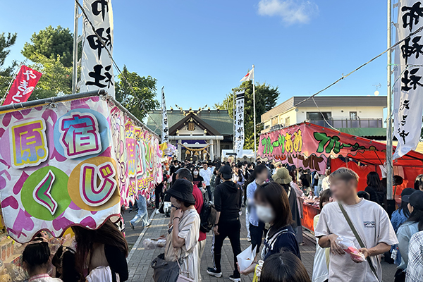 小さな子どもを連れた家族連れ、お年寄りや若い人などでにぎわい、境内では焼きそば、たこやき、綿あめなどの露店が多数出店し、秋祭りにふさわしい雰囲気が演出されていました。