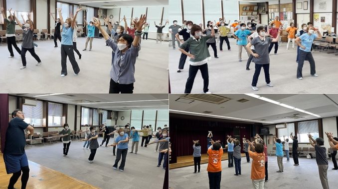 入念な準備体操の後、いくつかのフレーズごとに練習し、あっという間に3分数十秒の全曲を通して踊ります。なじみのある歌謡曲で体を動かすことで、筋力アップやストレス発散、音程やリズムをとることで脳が活性化して認知症予防にもつながります。