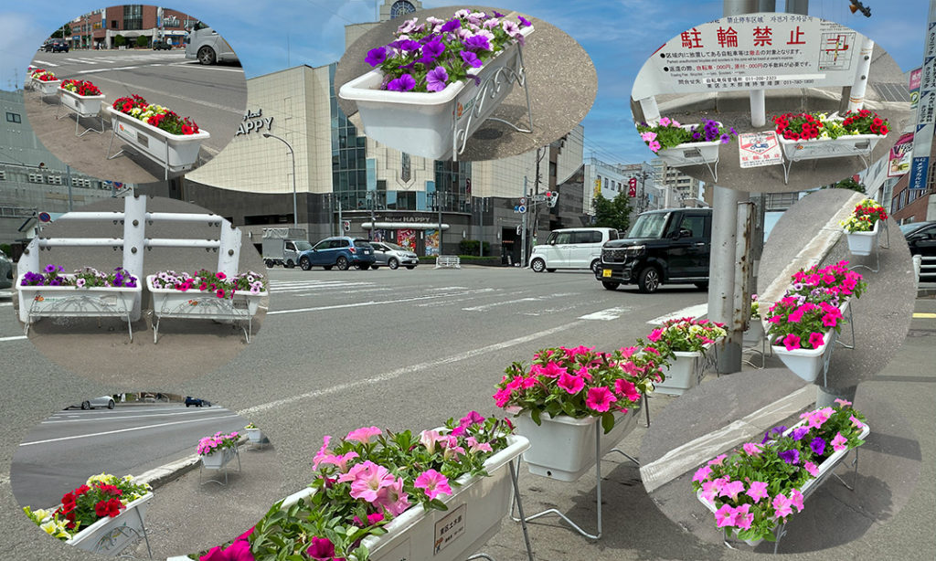 色とりどりの花プランターで地下鉄栄町交差点を飾り、自転車の違法駐輪を防止し、道行く人たちに潤いを与えてきた「花いっぱい事業」が9月20日終了し、プランターを回収しました。今年は、酷暑続きで花のいたみが激しく、昨年より早めの撤収になりました。