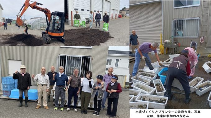 20日朝から栄町交差点、栄東まちづくりセンター、東老人福祉センター、ひのまる児童会館、ハッピーハッチ、つどーむからトラックで回収し、花プランターを毎年土壌づくりを担っていただいている阿知良茂さん宅へ運びました。ここでは、土を空けて、肥料を混ぜながら撹拌し、土壌づくりを実施し、袋に詰めて来年の出番まで保管します。