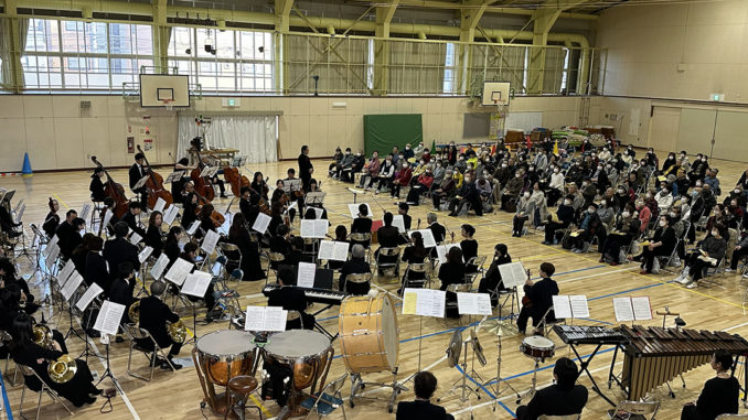 札幌フィルハーモニー管弦楽団の演奏会が、11月15日、栄小学校(東区北42条東10丁目)の体育館で開催されました。シニア憩いの広場と題した、栄東地区福祉のまち推進センター、栄東地区まちづくり未来会議、栄東連合町内会の共催事業で、148名のシニアや栄小学校の児童・保護者が参加しました。