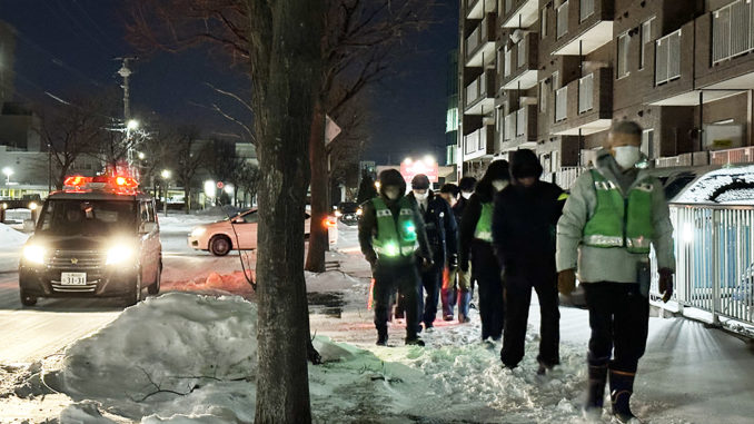 氷点下5度の厳寒の中、栄町町内会(五十嵐力・会長。加入世帯1000世帯)が歳末の夜、防犯パトロールを実施しました。これは、同町内会で20年以上続く恒例行事です。参加したのは、同町内会の役員など9名と栄東交番の警察官2名を含めて合計11名です。