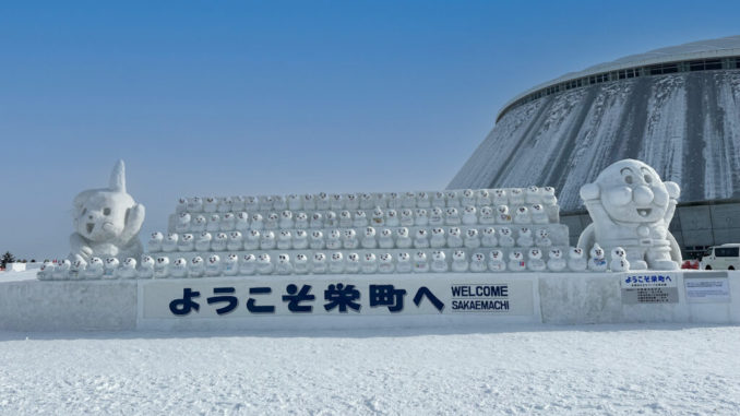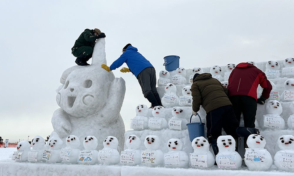 ウエルカム雪像制作は、今回が15回目です。会場の入り口に鎮座する横14m、高さ3mの雪像は、両サイドにピカチュウ、アンパンマン、真ん中に小学生が制作した雪だるまが100基ほど並びます。観光客の記念撮影場所としても定着しています。