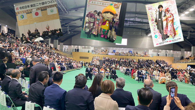 1月11日、「東区二十歳のつどい」が北ガスアリーナ札幌 46 (中央区北 4 条東 6 丁目)で開催されました。東区では、約2,300人(2005年4月2日~翌年4月1日に生まれた方)がこのつどいの対象者ですが、うち約1500人が出席しました。