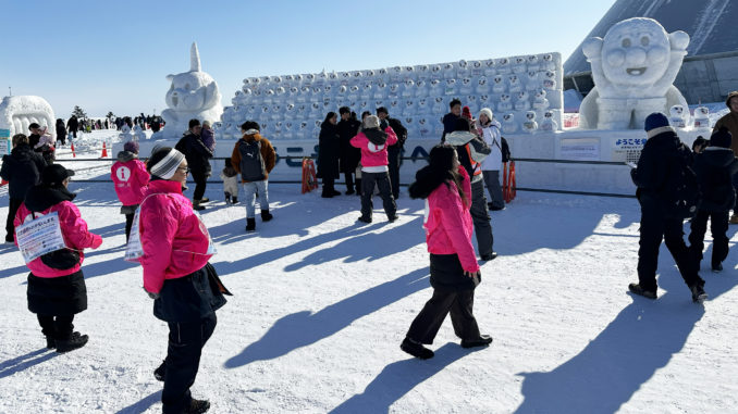 最低気温がマイナス8℃と冷え込む雪まつりの週末、栄東のウエルカム雪像前では、実行委員や青少年育成委員、町内会役員などがシャッター押しのボランティアを実施しました。