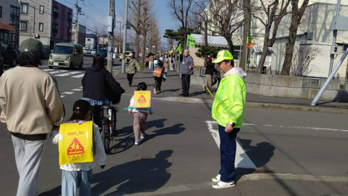 地域の方は、「おはようございます」と声をかけ、近づく自動車に注意を払いながら、子どもたちを安全に誘導していました。こうした優しい目に見守られながら、新一年生もきっと楽しい学校生活を送ってくれることでしょう。