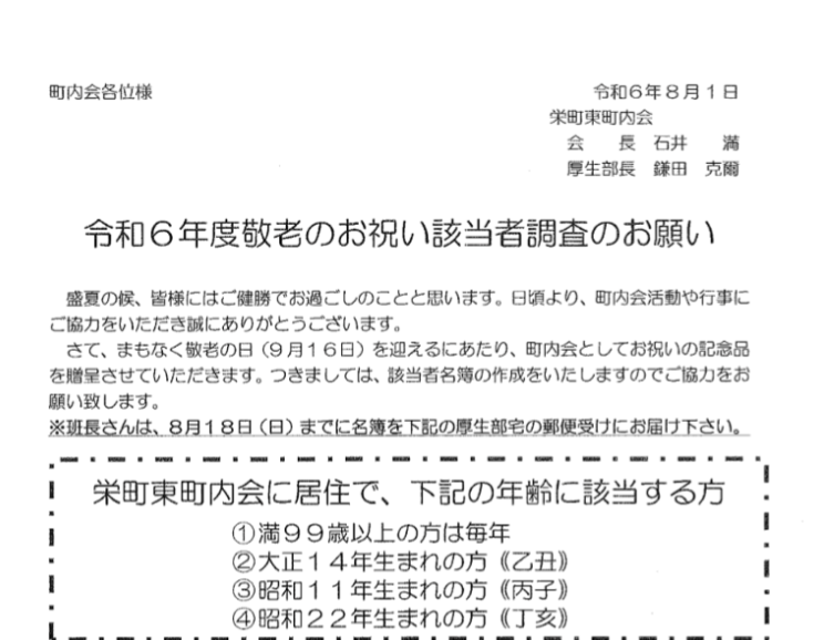 ご長寿をお祝い「敬老の日」 2024年9月16日 mayumi たまねぎ通信 0 今年度も該当される方は8月の回覧板に記入してもらいました。 該当される希望者は13名(喜寿9名・米寿2名・白寿2名)敬老の日の早朝、全員にお祝いの品をお渡しすることができました。 皆様方には、いつまでも健やかに人生をお過ごしになられますよう、心よりご祈念申し上げます。 「敬老のお祝い」に尽力していただいた会長はじめ、役員のみなさまありがとうございました。 たまねぎ通信