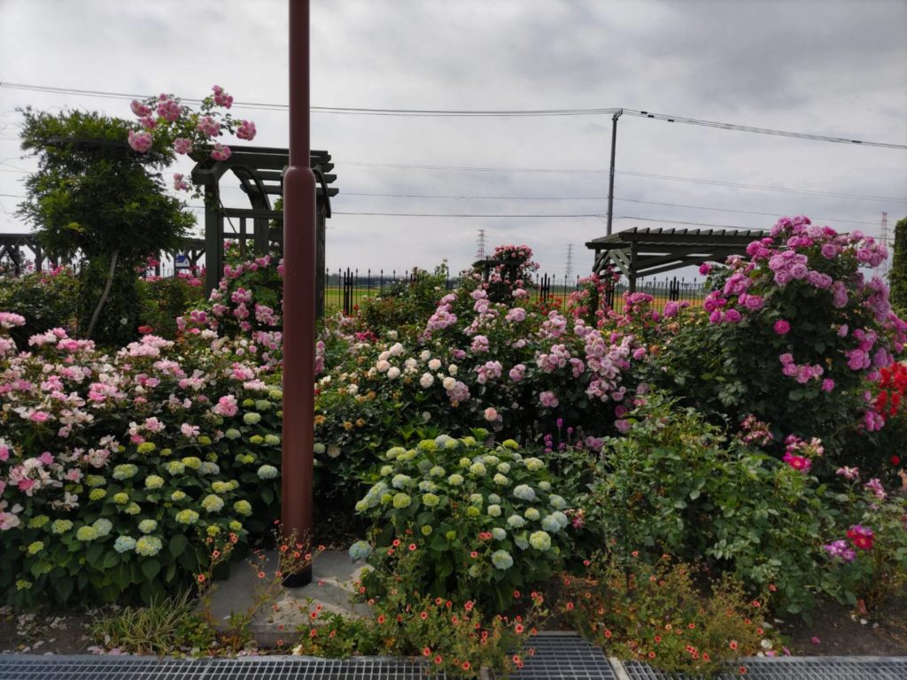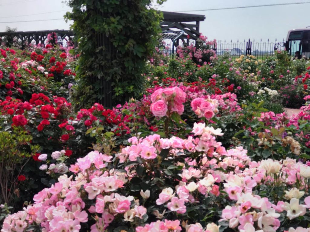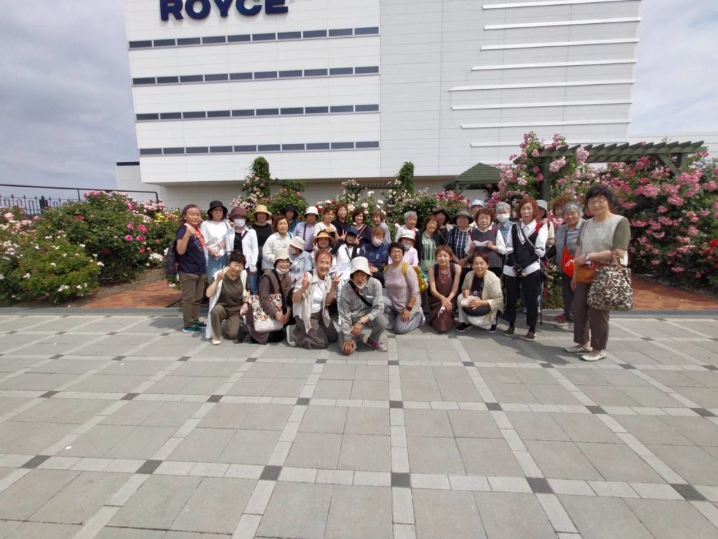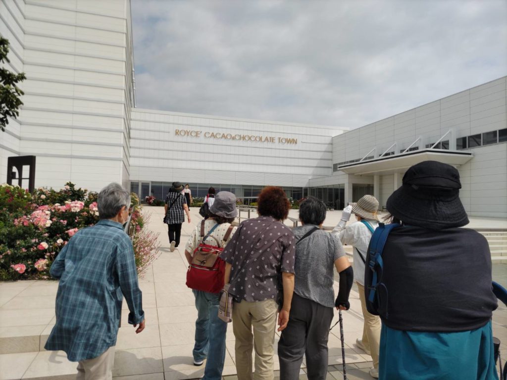 程なく最初の目的地ロイズタウン工場店に到着。バスを降りた途端バラの香りがただよい、まるで参加者たちを歓迎するかのようでした。ちょうど見ごろのバラ庭園をバックに集合写真を撮ったあとは自由行動。庭園の散策や売店でのお買い物、アイス片手に一休みと思い思いの時間を過ごしました。