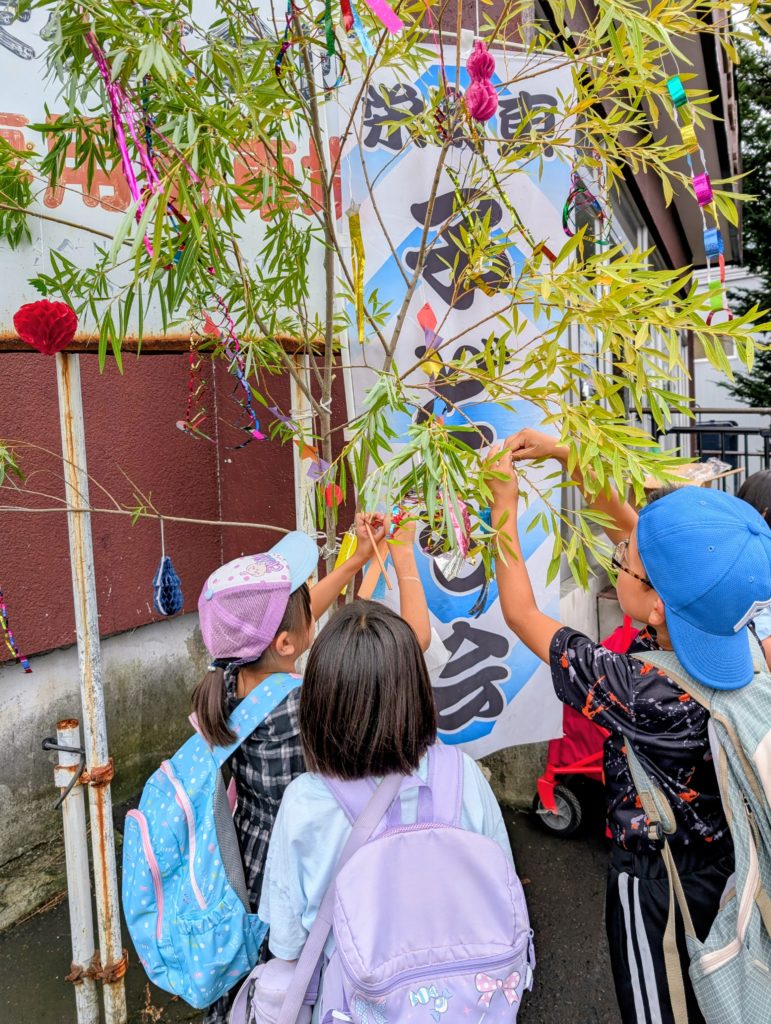 今年の「ろうそくだせ!」は、今にも雨が降り出しそうな空模様の中、栄が丘会館の駐車場に浴衣や甚平姿の子どもたち約70名が集まりました。地域の方々のご協力で、大きな笹の木が用意され、子どもたちはそこに願い事を書いた短冊を飾りました。